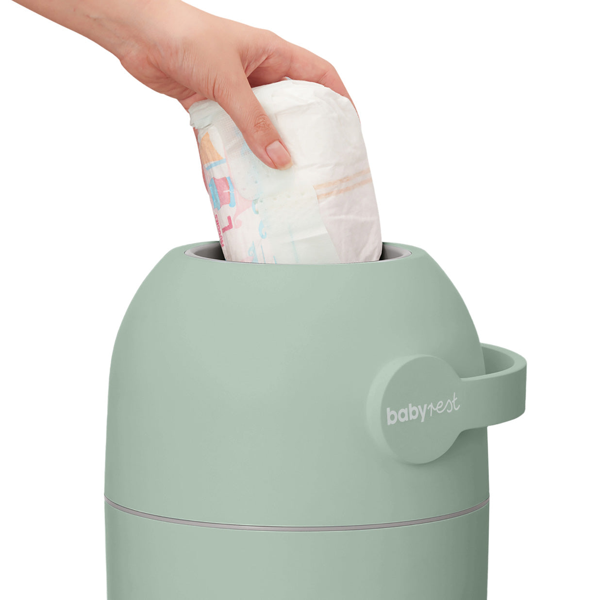The BabyRest Aster Sage combines luxury style with effective odour control like no other. Say goodbye to unsightly nappy bins and hello to one so aesthetic you'll want to display it. To use, simply flip the handle over for the opening to appear.